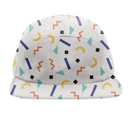 Five panel baseball hat with adjustable nylon strap for sizing.