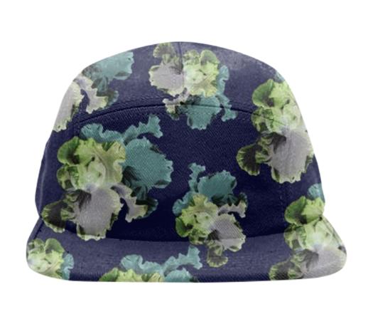 Five panel baseball hat with adjustable nylon strap for sizing.