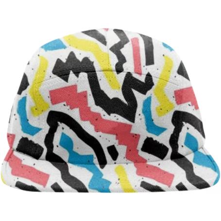 Five panel baseball hat with adjustable nylon strap for sizing.