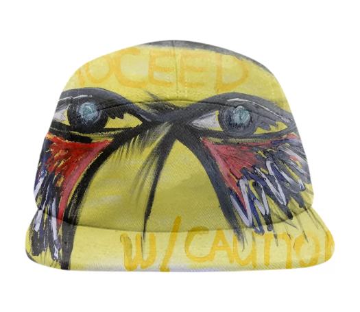 Five panel baseball hat with adjustable nylon strap for sizing.