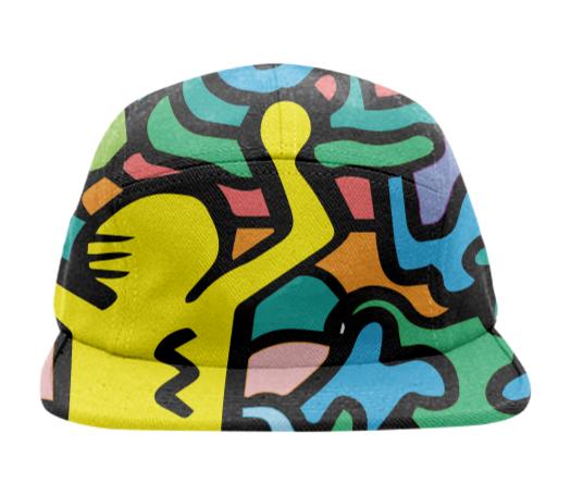 Five panel baseball hat with adjustable nylon strap for sizing.