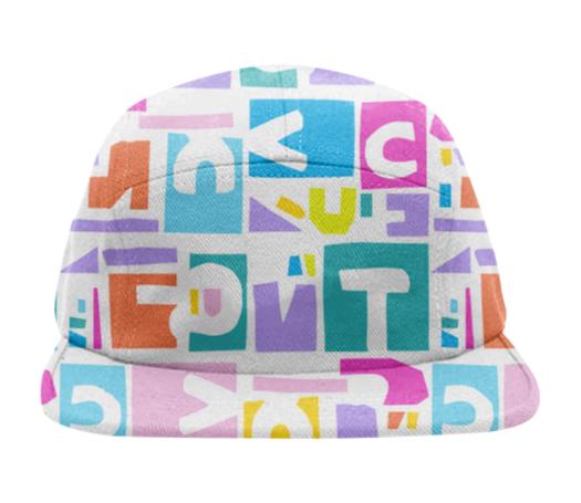 Five panel baseball hat with adjustable nylon strap for sizing.