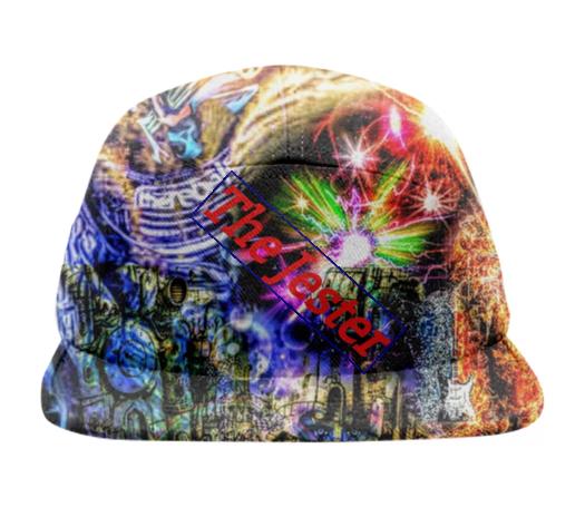 Five panel baseball hat with adjustable nylon strap for sizing.