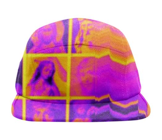 Five panel baseball hat with adjustable nylon strap for sizing.