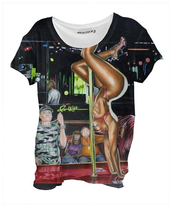 Loose fitting scoop neck shirt with nice drape and curved bottom hem.