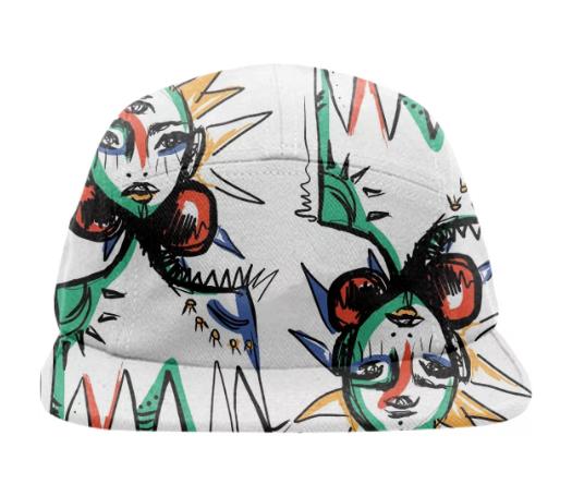 Five panel baseball hat with adjustable nylon strap for sizing.