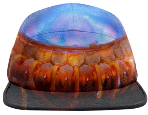 Five panel baseball hat with adjustable nylon strap for sizing.