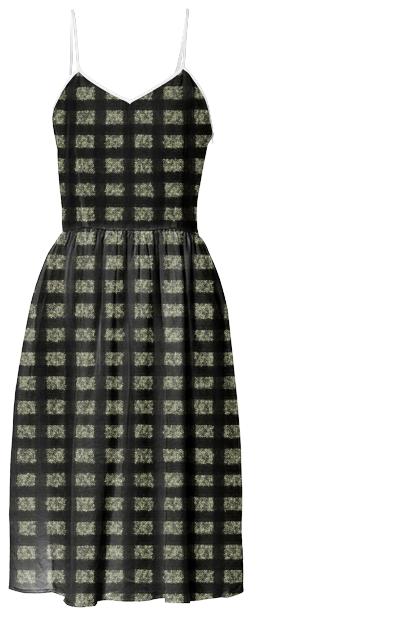 Knee length v-neckline dress with adjustable spaghetti straps shirred waist and invisible side seam zipper.