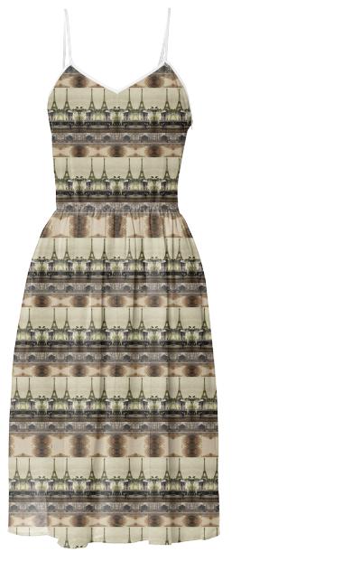 Knee length v-neckline dress with adjustable spaghetti straps shirred waist and invisible side seam zipper.