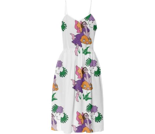 Knee length v-neckline dress with adjustable spaghetti straps shirred waist and invisible side seam zipper.