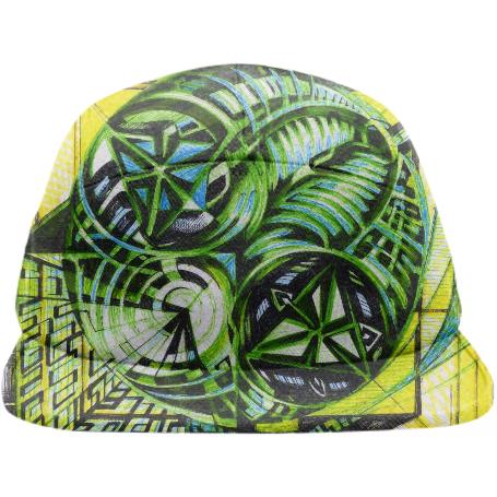Five panel baseball hat with adjustable nylon strap for sizing.