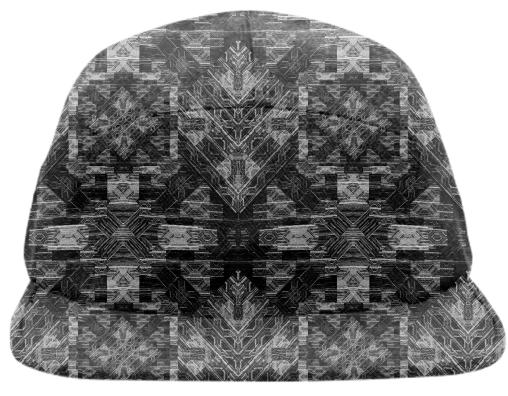 Five panel baseball hat with adjustable nylon strap for sizing.
