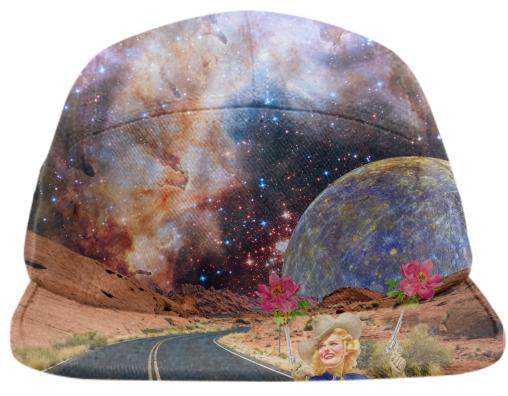 Five panel baseball hat with adjustable nylon strap for sizing.