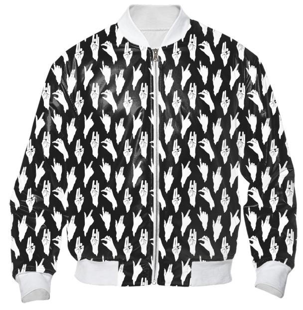 Light weight bombr jacket with your choice of white or black ribbing slight padding zip up front and side pockets. The inside is adorned with PAOM straps for swinging over your shoulders so you dont have to hold it.