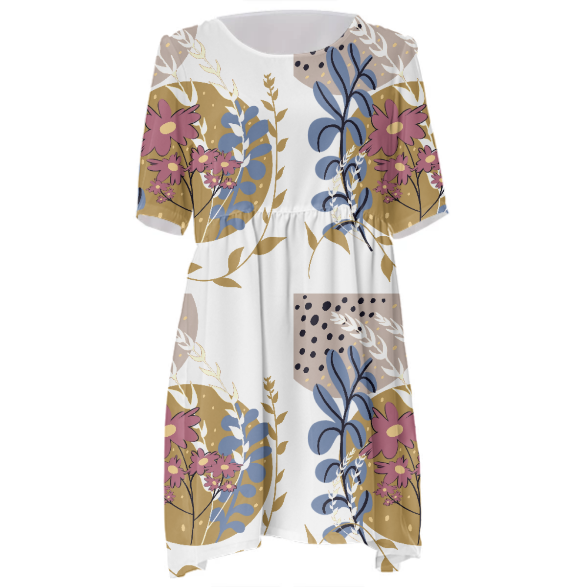 Loose swing fit babydoll dress with shirred waist short sleeves and scoop neckline. The uploaded file will be printed on the entire front and be mirrored on the back. The uploaded file will be printed on the entire front and be mirrored on the back. Because of our cut and sew process some print elements on pockets seams and sleeves might not match up. For best results please upload a PNG or JPG with RGB color profile and dimensions of at least 35 inches width by 40 inches length. DPI can be as low as 72. Since every piece is custom made, it may take 2-4 weeks for delivery. Made in our studio (Shanghai).