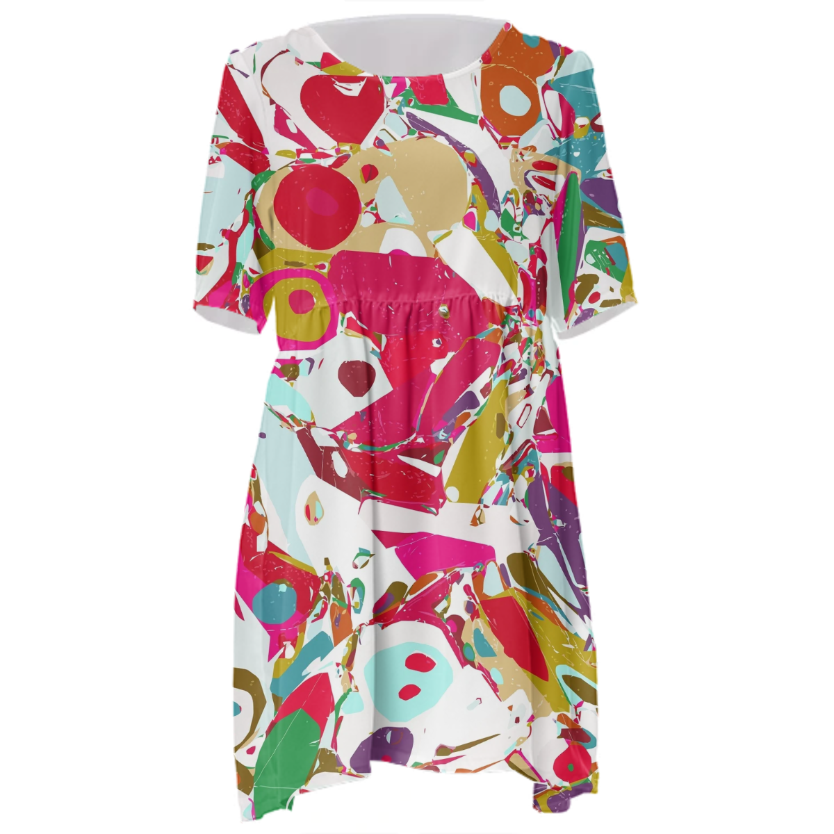 Loose swing fit babydoll dress with shirred waist short sleeves and scoop neckline. The uploaded file will be printed on the entire front and be mirrored on the back. The uploaded file will be printed on the entire front and be mirrored on the back. Because of our cut and sew process some print elements on pockets seams and sleeves might not match up. For best results please upload a PNG or JPG with RGB color profile and dimensions of at least 35 inches width by 40 inches length. DPI can be as low as 72. Since every piece is custom made, it may take 2-4 weeks for delivery. Made in our studio (Shanghai).
