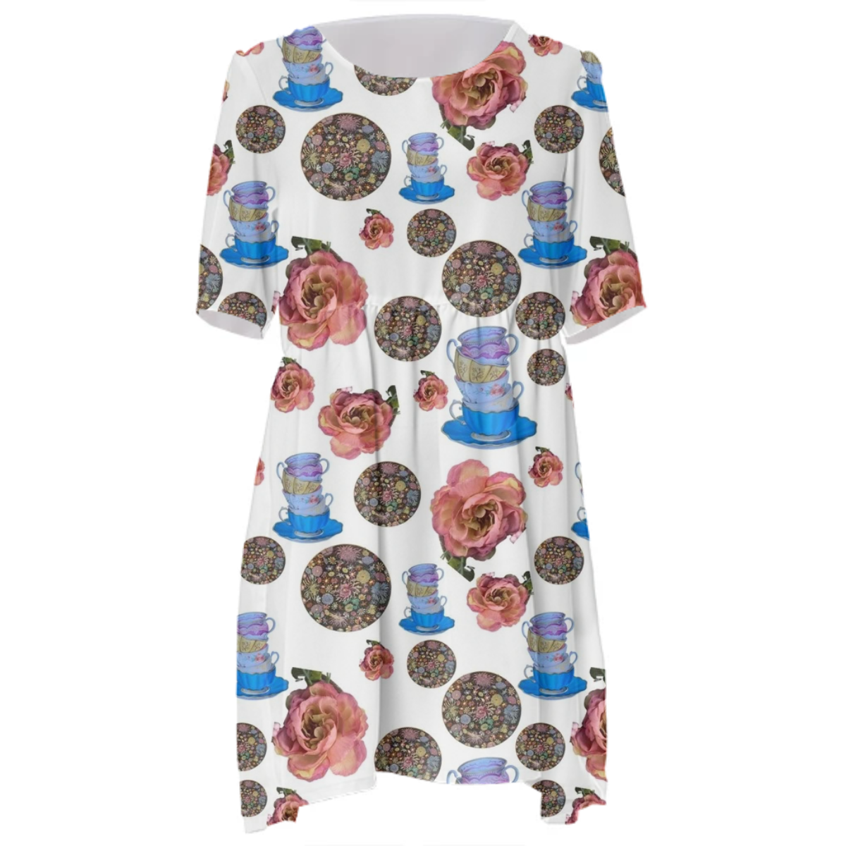 Loose swing fit babydoll dress with shirred waist short sleeves and scoop neckline. The uploaded file will be printed on the entire front and be mirrored on the back. The uploaded file will be printed on the entire front and be mirrored on the back. Because of our cut and sew process some print elements on pockets seams and sleeves might not match up. For best results please upload a PNG or JPG with RGB color profile and dimensions of at least 35 inches width by 40 inches length. DPI can be as low as 72. Since every piece is custom made, it may take 2-4 weeks for delivery. Made in our studio (Shanghai).