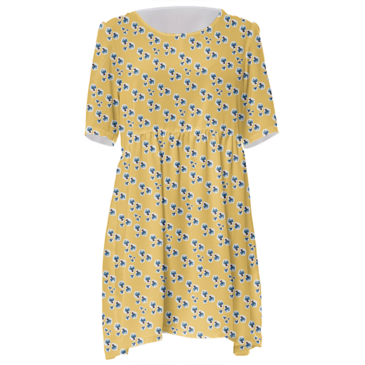 Loose swing fit babydoll dress with shirred waist short sleeves and scoop neckline. The uploaded file will be printed on the entire front and be mirrored on the back. The uploaded file will be printed on the entire front and be mirrored on the back. Because of our cut and sew process some print elements on pockets seams and sleeves might not match up. For best results please upload a PNG or JPG with RGB color profile and dimensions of at least 35 inches width by 40 inches length. DPI can be as low as 72. Since every piece is custom made, it may take 2-4 weeks for delivery. Made in our studio (Shanghai).
