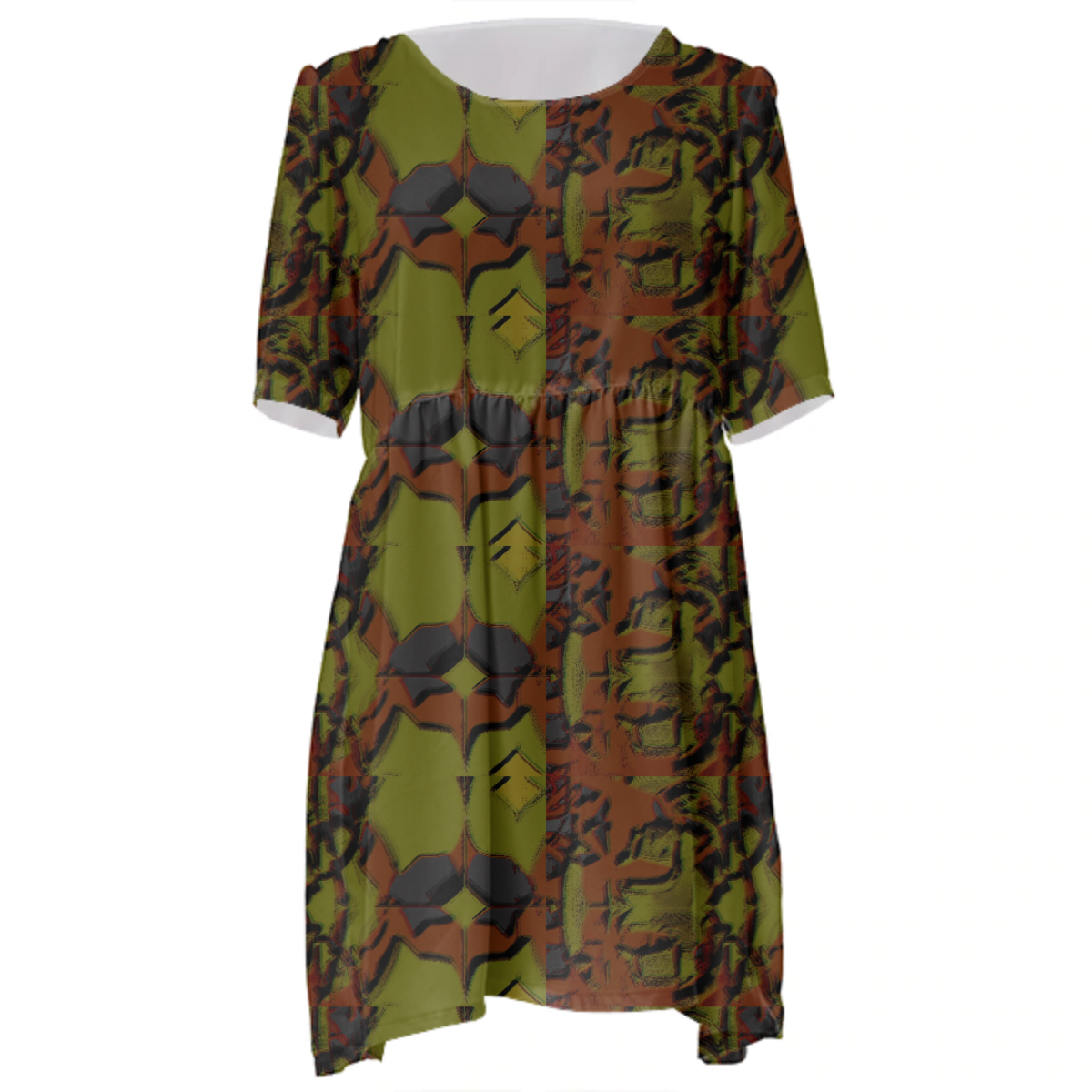 Loose swing fit babydoll dress with shirred waist short sleeves and scoop neckline. The uploaded file will be printed on the entire front and be mirrored on the back. The uploaded file will be printed on the entire front and be mirrored on the back. Because of our cut and sew process some print elements on pockets seams and sleeves might not match up. For best results please upload a PNG or JPG with RGB color profile and dimensions of at least 35 inches width by 40 inches length. DPI can be as low as 72. Since every piece is custom made, it may take 2-4 weeks for delivery. Made in our studio (Shanghai).