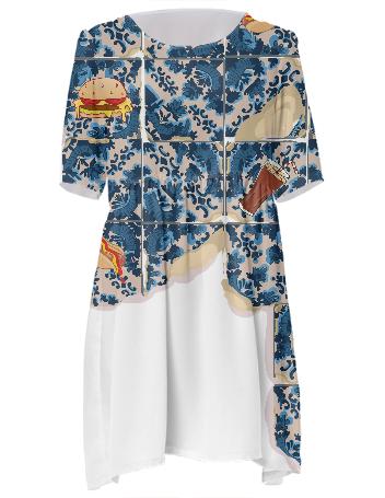 Loose swing fit babydoll dress with shirred waist short sleeves and scoop neckline. The uploaded file will be printed on the entire front and be mirrored on the back. The uploaded file will be printed on the entire front and be mirrored on the back. Because of our cut and sew process some print elements on pockets seams and sleeves might not match up. For best results please upload a PNG or JPG with RGB color profile and dimensions of at least 35 inches width by 40 inches length. DPI can be as low as 72. Since every piece is custom made, it may take 2-4 weeks for delivery. Made in our studio (Shanghai).