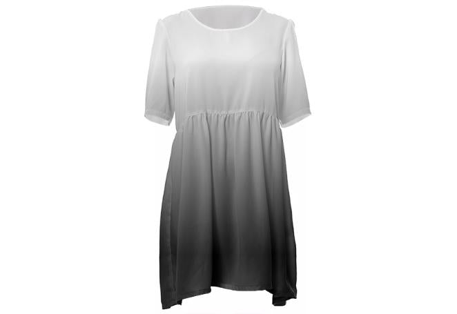 Loose swing fit babydoll dress with shirred waist short sleeves and scoop neckline. The uploaded file will be printed on the entire front and be mirrored on the back. The uploaded file will be printed on the entire front and be mirrored on the back. Because of our cut and sew process some print elements on pockets seams and sleeves might not match up. For best results please upload a PNG or JPG with RGB color profile and dimensions of at least 35 inches width by 40 inches length. DPI can be as low as 72. Since every piece is custom made, it may take 2-4 weeks for delivery. Made in our studio (Shanghai).