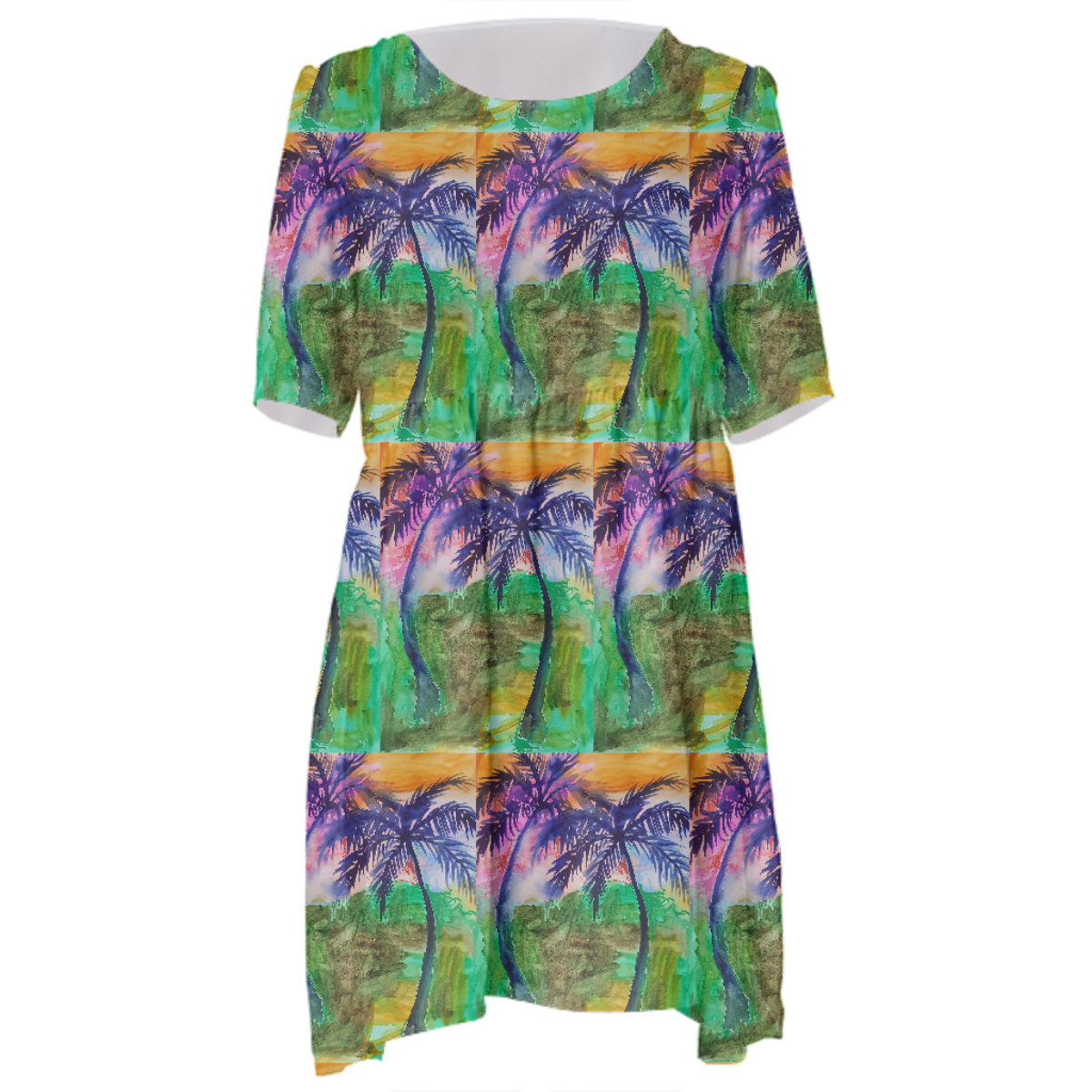 Loose swing fit babydoll dress with shirred waist short sleeves and scoop neckline. The uploaded file will be printed on the entire front and be mirrored on the back. The uploaded file will be printed on the entire front and be mirrored on the back. Because of our cut and sew process some print elements on pockets seams and sleeves might not match up. For best results please upload a PNG or JPG with RGB color profile and dimensions of at least 35 inches width by 40 inches length. DPI can be as low as 72. Since every piece is custom made, it may take 2-4 weeks for delivery. Made in our studio (Shanghai).