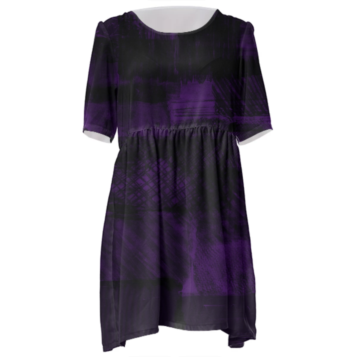 Loose swing fit babydoll dress with shirred waist short sleeves and scoop neckline. The uploaded file will be printed on the entire front and be mirrored on the back. The uploaded file will be printed on the entire front and be mirrored on the back. Because of our cut and sew process some print elements on pockets seams and sleeves might not match up. For best results please upload a PNG or JPG with RGB color profile and dimensions of at least 35 inches width by 40 inches length. DPI can be as low as 72. Since every piece is custom made, it may take 2-4 weeks for delivery. Made in our studio (Shanghai).