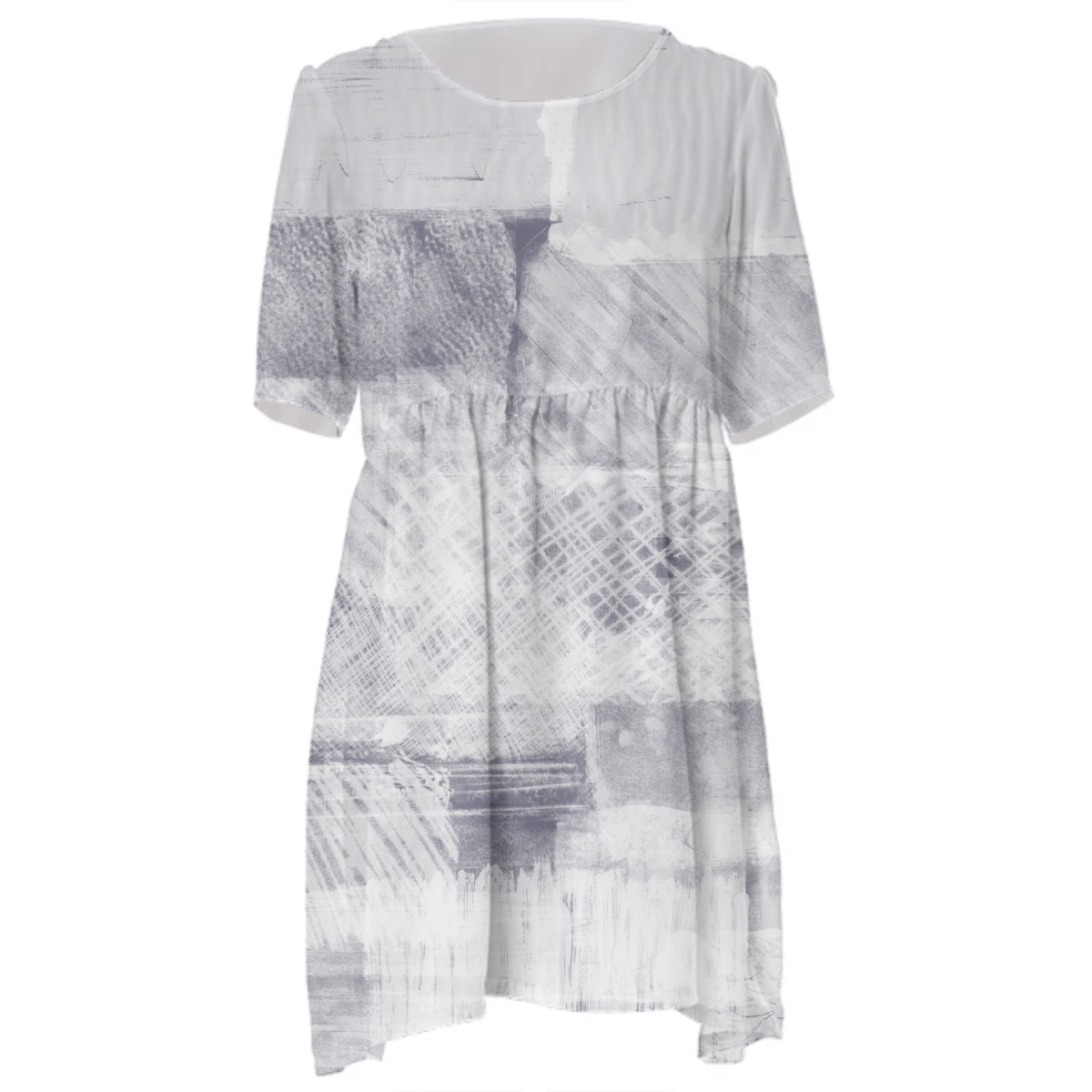 Loose swing fit babydoll dress with shirred waist short sleeves and scoop neckline. The uploaded file will be printed on the entire front and be mirrored on the back. The uploaded file will be printed on the entire front and be mirrored on the back. Because of our cut and sew process some print elements on pockets seams and sleeves might not match up. For best results please upload a PNG or JPG with RGB color profile and dimensions of at least 35 inches width by 40 inches length. DPI can be as low as 72. Since every piece is custom made, it may take 2-4 weeks for delivery. Made in our studio (Shanghai).