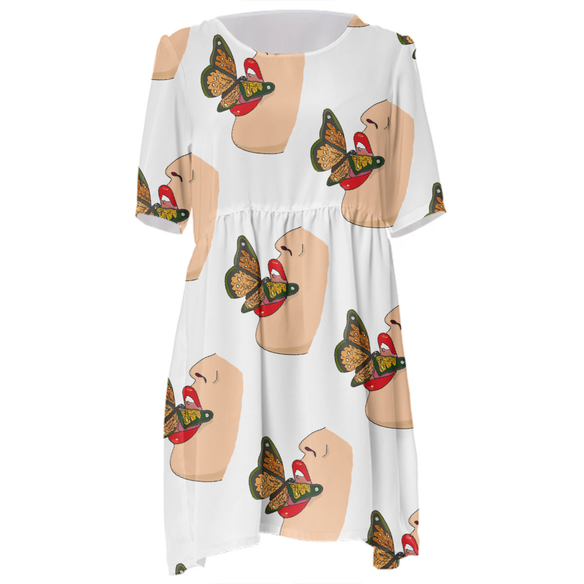 Loose swing fit babydoll dress with shirred waist short sleeves and scoop neckline. The uploaded file will be printed on the entire front and be mirrored on the back. The uploaded file will be printed on the entire front and be mirrored on the back. Because of our cut and sew process some print elements on pockets seams and sleeves might not match up. For best results please upload a PNG or JPG with RGB color profile and dimensions of at least 35 inches width by 40 inches length. DPI can be as low as 72. Since every piece is custom made, it may take 2-4 weeks for delivery. Made in our studio (Shanghai).