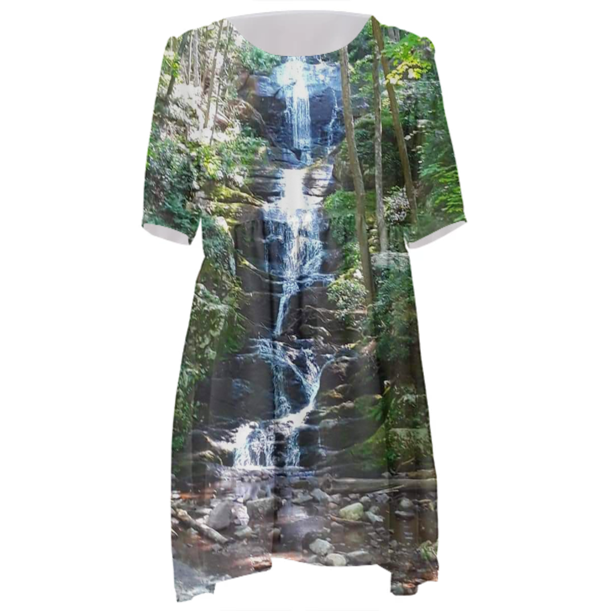 Loose swing fit babydoll dress with shirred waist short sleeves and scoop neckline. The uploaded file will be printed on the entire front and be mirrored on the back. The uploaded file will be printed on the entire front and be mirrored on the back. Because of our cut and sew process some print elements on pockets seams and sleeves might not match up. For best results please upload a PNG or JPG with RGB color profile and dimensions of at least 35 inches width by 40 inches length. DPI can be as low as 72. Since every piece is custom made, it may take 2-4 weeks for delivery. Made in our studio (Shanghai).