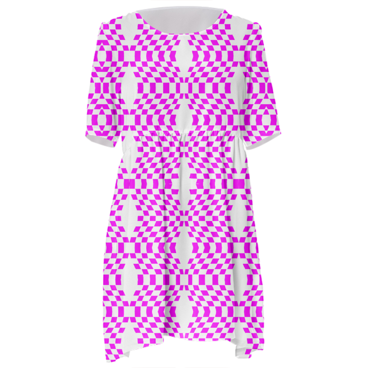 Loose swing fit babydoll dress with shirred waist short sleeves and scoop neckline. The uploaded file will be printed on the entire front and be mirrored on the back. The uploaded file will be printed on the entire front and be mirrored on the back. Because of our cut and sew process some print elements on pockets seams and sleeves might not match up. For best results please upload a PNG or JPG with RGB color profile and dimensions of at least 35 inches width by 40 inches length. DPI can be as low as 72. Since every piece is custom made, it may take 2-4 weeks for delivery. Made in our studio (Shanghai).