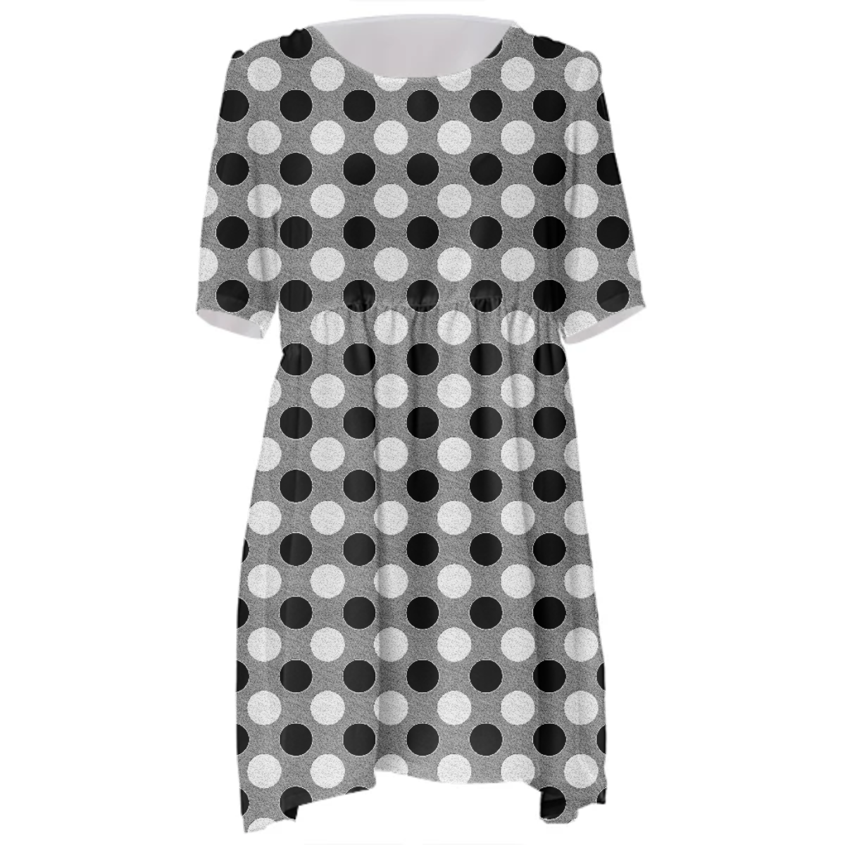Loose swing fit babydoll dress with shirred waist short sleeves and scoop neckline. The uploaded file will be printed on the entire front and be mirrored on the back. The uploaded file will be printed on the entire front and be mirrored on the back. Because of our cut and sew process some print elements on pockets seams and sleeves might not match up. For best results please upload a PNG or JPG with RGB color profile and dimensions of at least 35 inches width by 40 inches length. DPI can be as low as 72. Since every piece is custom made, it may take 2-4 weeks for delivery. Made in our studio (Shanghai).