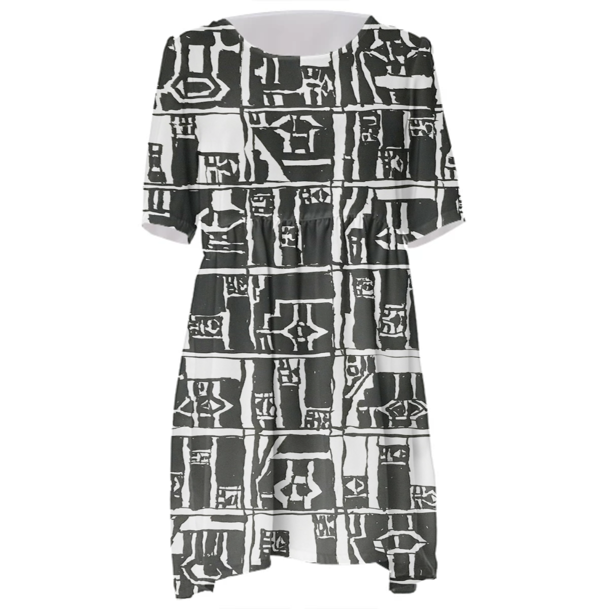 Loose swing fit babydoll dress with shirred waist short sleeves and scoop neckline. The uploaded file will be printed on the entire front and be mirrored on the back. The uploaded file will be printed on the entire front and be mirrored on the back. Because of our cut and sew process some print elements on pockets seams and sleeves might not match up. For best results please upload a PNG or JPG with RGB color profile and dimensions of at least 35 inches width by 40 inches length. DPI can be as low as 72. Since every piece is custom made, it may take 2-4 weeks for delivery. Made in our studio (Shanghai).