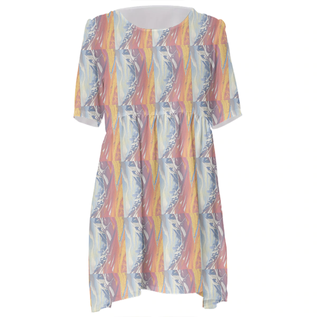 Loose swing fit babydoll dress with shirred waist short sleeves and scoop neckline. The uploaded file will be printed on the entire front and be mirrored on the back. The uploaded file will be printed on the entire front and be mirrored on the back. Because of our cut and sew process some print elements on pockets seams and sleeves might not match up. For best results please upload a PNG or JPG with RGB color profile and dimensions of at least 35 inches width by 40 inches length. DPI can be as low as 72. Since every piece is custom made, it may take 2-4 weeks for delivery. Made in our studio (Shanghai).