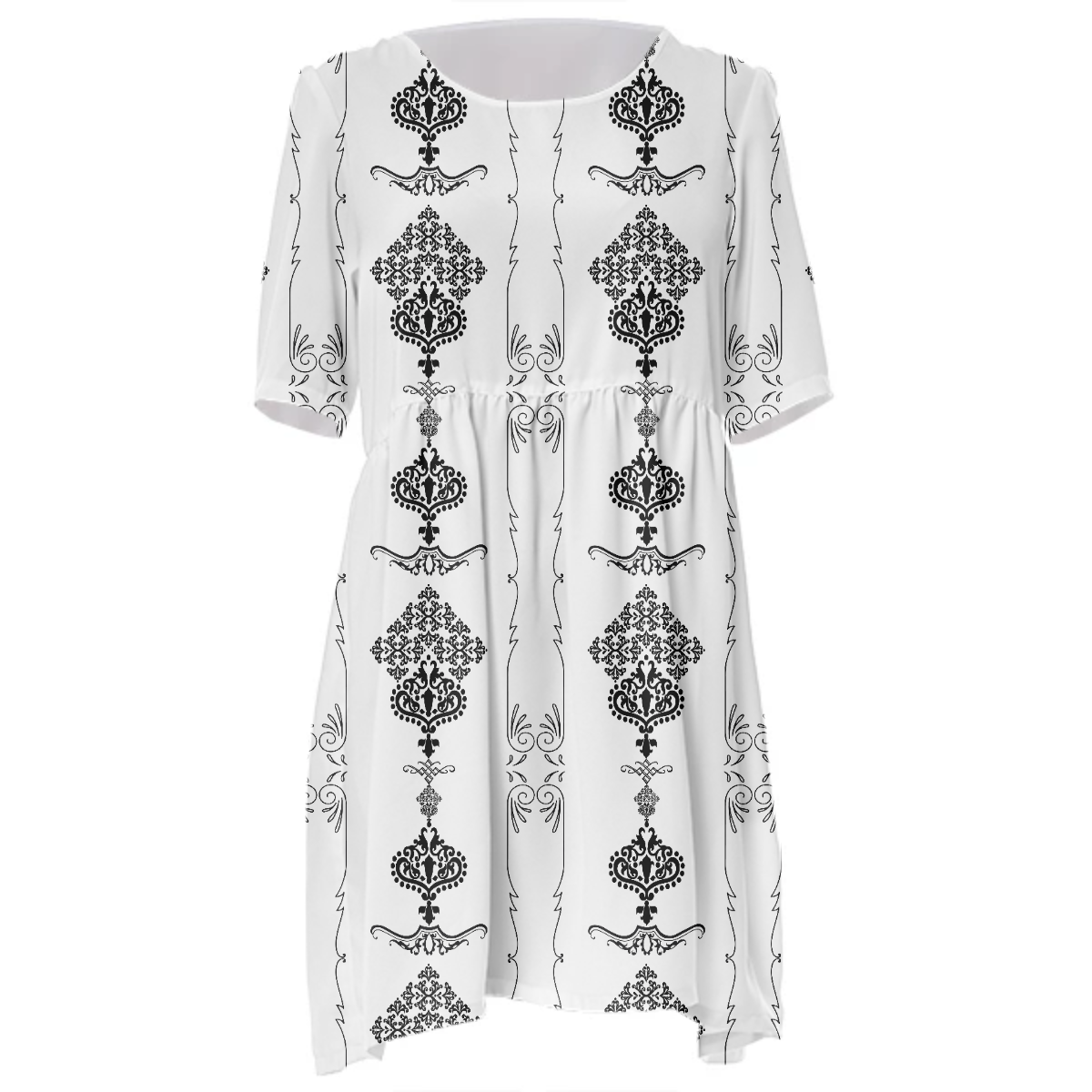 Loose swing fit babydoll dress with shirred waist short sleeves and scoop neckline. The uploaded file will be printed on the entire front and be mirrored on the back. The uploaded file will be printed on the entire front and be mirrored on the back. Because of our cut and sew process some print elements on pockets seams and sleeves might not match up. For best results please upload a PNG or JPG with RGB color profile and dimensions of at least 35 inches width by 40 inches length. DPI can be as low as 72. Since every piece is custom made, it may take 2-4 weeks for delivery. Made in our studio (Shanghai).