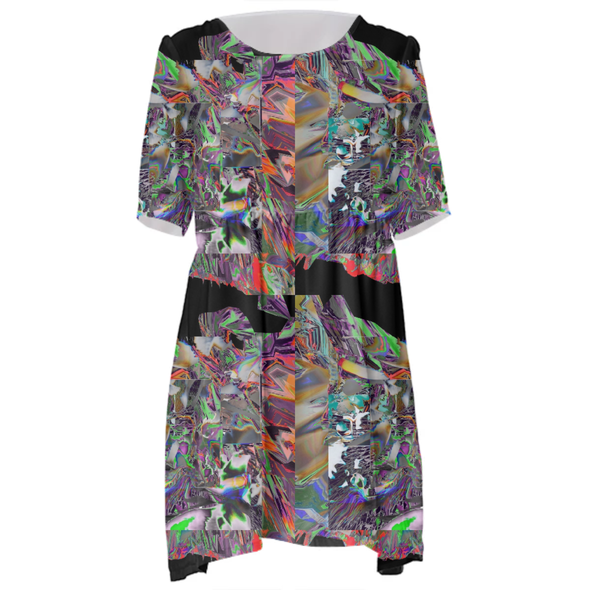 Loose swing fit babydoll dress with shirred waist short sleeves and scoop neckline. The uploaded file will be printed on the entire front and be mirrored on the back. The uploaded file will be printed on the entire front and be mirrored on the back. Because of our cut and sew process some print elements on pockets seams and sleeves might not match up. For best results please upload a PNG or JPG with RGB color profile and dimensions of at least 35 inches width by 40 inches length. DPI can be as low as 72. Since every piece is custom made, it may take 2-4 weeks for delivery. Made in our studio (Shanghai).