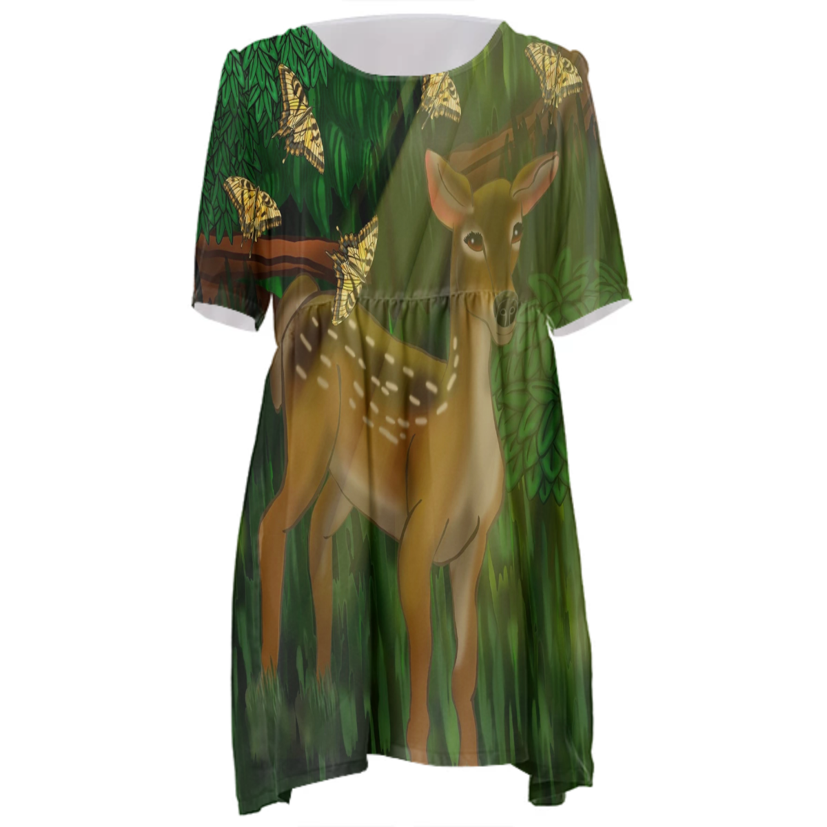 Loose swing fit babydoll dress with shirred waist short sleeves and scoop neckline. The uploaded file will be printed on the entire front and be mirrored on the back. The uploaded file will be printed on the entire front and be mirrored on the back. Because of our cut and sew process some print elements on pockets seams and sleeves might not match up. For best results please upload a PNG or JPG with RGB color profile and dimensions of at least 35 inches width by 40 inches length. DPI can be as low as 72. Since every piece is custom made, it may take 2-4 weeks for delivery. Made in our studio (Shanghai).