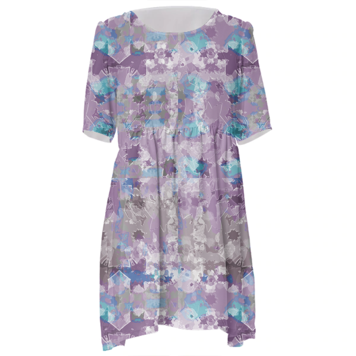 Loose swing fit babydoll dress with shirred waist short sleeves and scoop neckline. The uploaded file will be printed on the entire front and be mirrored on the back. The uploaded file will be printed on the entire front and be mirrored on the back. Because of our cut and sew process some print elements on pockets seams and sleeves might not match up. For best results please upload a PNG or JPG with RGB color profile and dimensions of at least 35 inches width by 40 inches length. DPI can be as low as 72. Since every piece is custom made, it may take 2-4 weeks for delivery. Made in our studio (Shanghai).