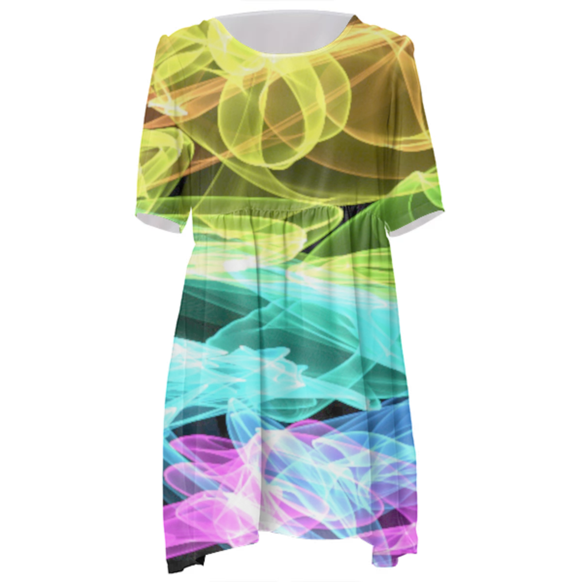 Loose swing fit babydoll dress with shirred waist short sleeves and scoop neckline. The uploaded file will be printed on the entire front and be mirrored on the back. The uploaded file will be printed on the entire front and be mirrored on the back. Because of our cut and sew process some print elements on pockets seams and sleeves might not match up. For best results please upload a PNG or JPG with RGB color profile and dimensions of at least 35 inches width by 40 inches length. DPI can be as low as 72. Since every piece is custom made, it may take 2-4 weeks for delivery. Made in our studio (Shanghai).