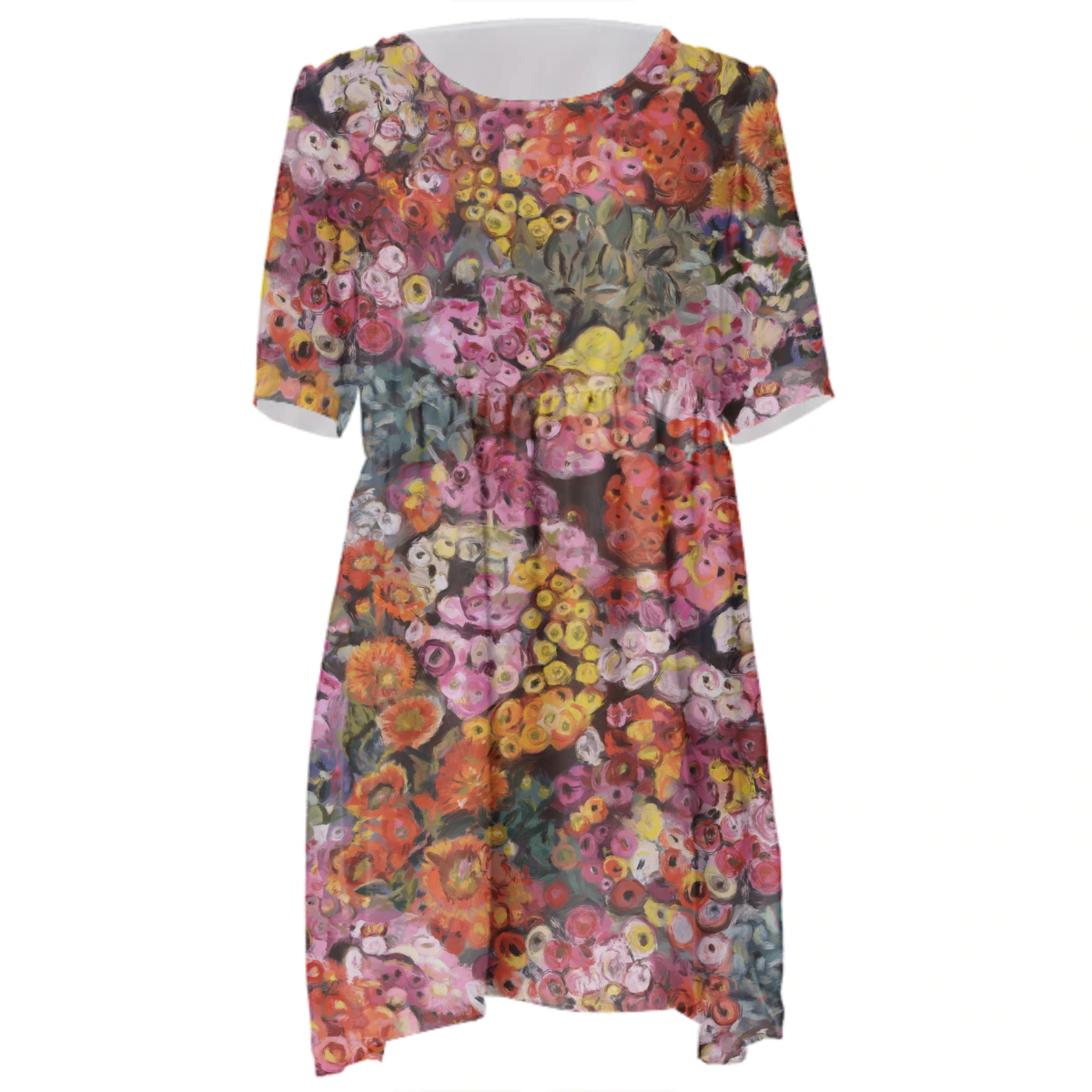Loose swing fit babydoll dress with shirred waist short sleeves and scoop neckline. The uploaded file will be printed on the entire front and be mirrored on the back. The uploaded file will be printed on the entire front and be mirrored on the back. Because of our cut and sew process some print elements on pockets seams and sleeves might not match up. For best results please upload a PNG or JPG with RGB color profile and dimensions of at least 35 inches width by 40 inches length. DPI can be as low as 72. Since every piece is custom made, it may take 2-4 weeks for delivery. Made in our studio (Shanghai).