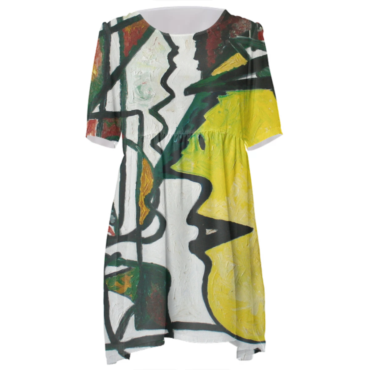 Loose swing fit babydoll dress with shirred waist short sleeves and scoop neckline. The uploaded file will be printed on the entire front and be mirrored on the back. The uploaded file will be printed on the entire front and be mirrored on the back. Because of our cut and sew process some print elements on pockets seams and sleeves might not match up. For best results please upload a PNG or JPG with RGB color profile and dimensions of at least 35 inches width by 40 inches length. DPI can be as low as 72. Since every piece is custom made, it may take 2-4 weeks for delivery. Made in our studio (Shanghai).