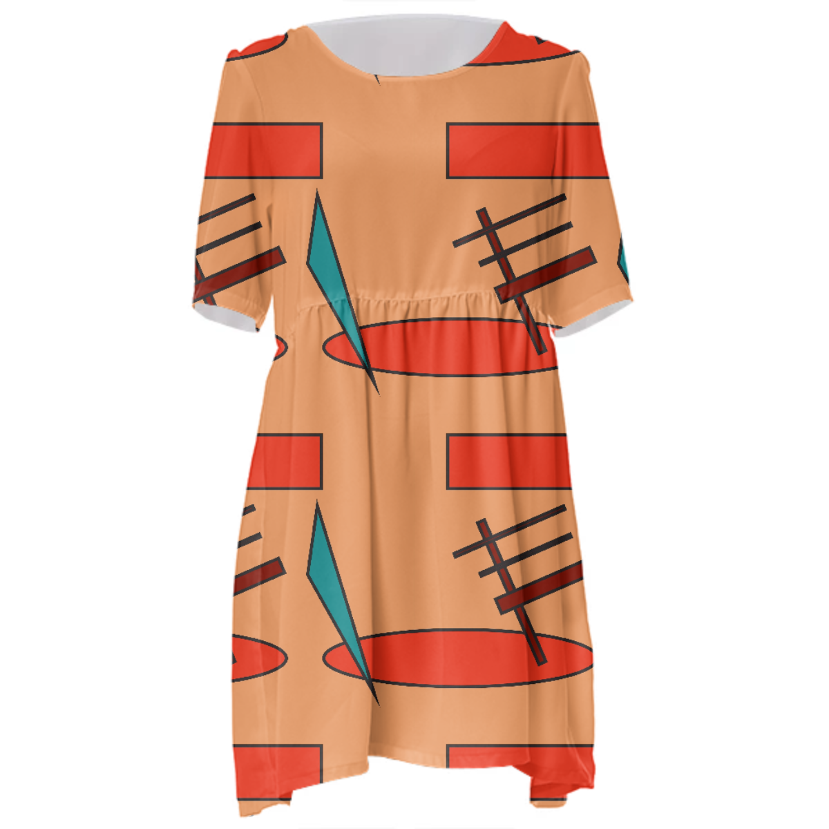 Loose swing fit babydoll dress with shirred waist short sleeves and scoop neckline. The uploaded file will be printed on the entire front and be mirrored on the back. The uploaded file will be printed on the entire front and be mirrored on the back. Because of our cut and sew process some print elements on pockets seams and sleeves might not match up. For best results please upload a PNG or JPG with RGB color profile and dimensions of at least 35 inches width by 40 inches length. DPI can be as low as 72. Since every piece is custom made, it may take 2-4 weeks for delivery. Made in our studio (Shanghai).