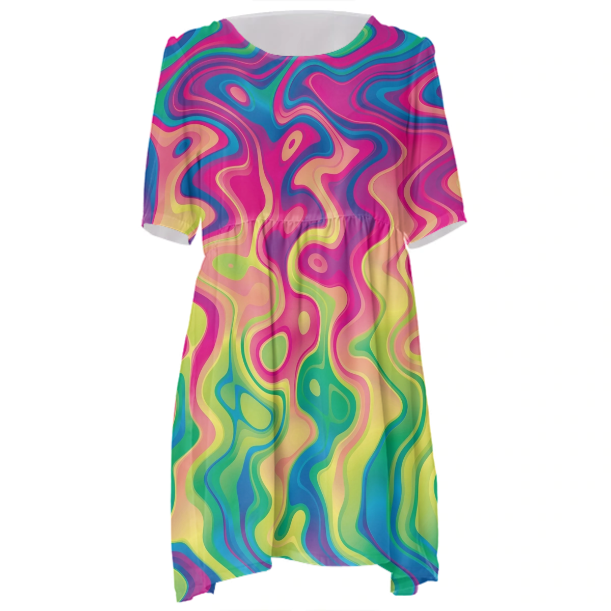 Loose swing fit babydoll dress with shirred waist short sleeves and scoop neckline. The uploaded file will be printed on the entire front and be mirrored on the back. The uploaded file will be printed on the entire front and be mirrored on the back. Because of our cut and sew process some print elements on pockets seams and sleeves might not match up. For best results please upload a PNG or JPG with RGB color profile and dimensions of at least 35 inches width by 40 inches length. DPI can be as low as 72. Since every piece is custom made, it may take 2-4 weeks for delivery. Made in our studio (Shanghai).