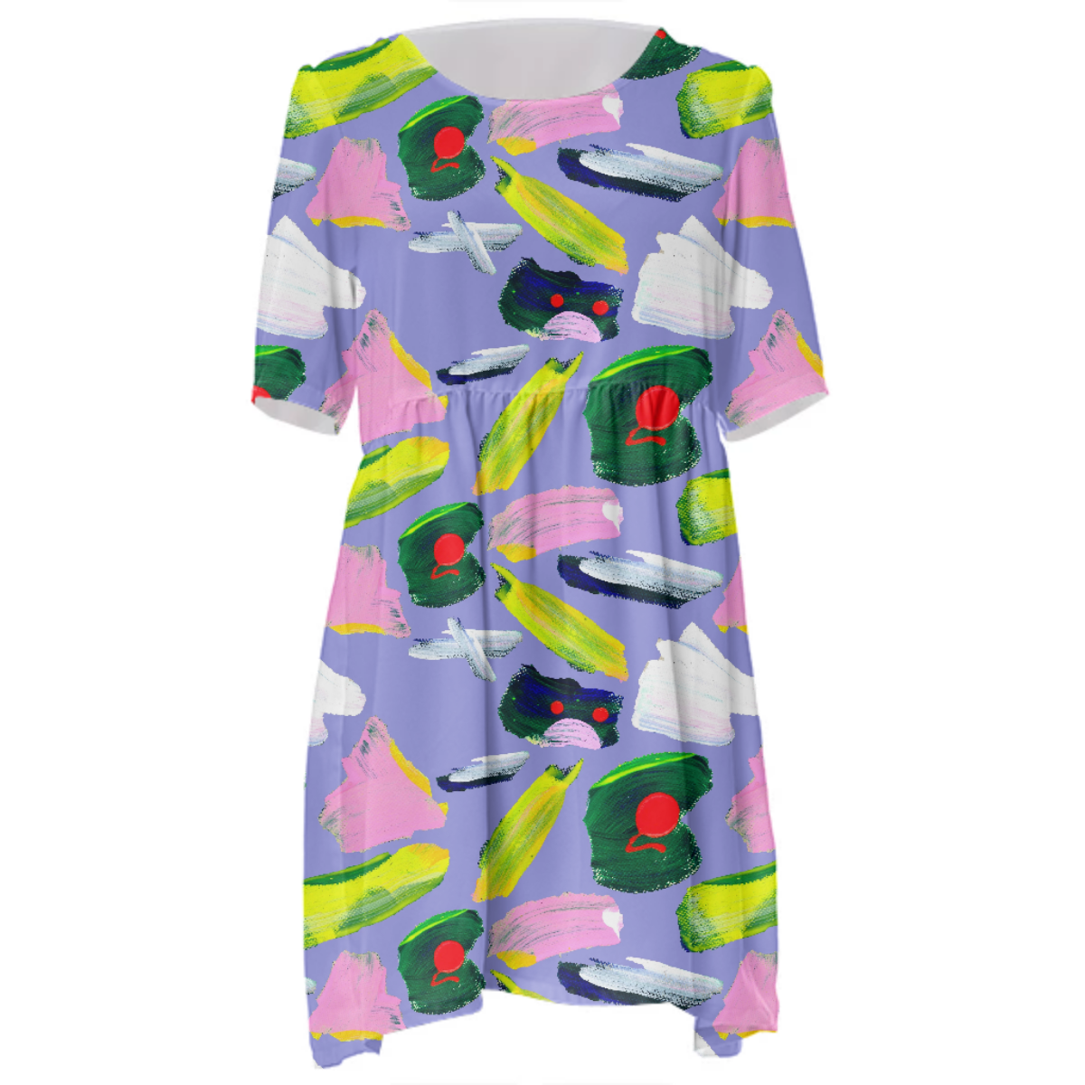 Loose swing fit babydoll dress with shirred waist short sleeves and scoop neckline. The uploaded file will be printed on the entire front and be mirrored on the back. The uploaded file will be printed on the entire front and be mirrored on the back. Because of our cut and sew process some print elements on pockets seams and sleeves might not match up. For best results please upload a PNG or JPG with RGB color profile and dimensions of at least 35 inches width by 40 inches length. DPI can be as low as 72. Since every piece is custom made, it may take 2-4 weeks for delivery. Made in our studio (Shanghai).