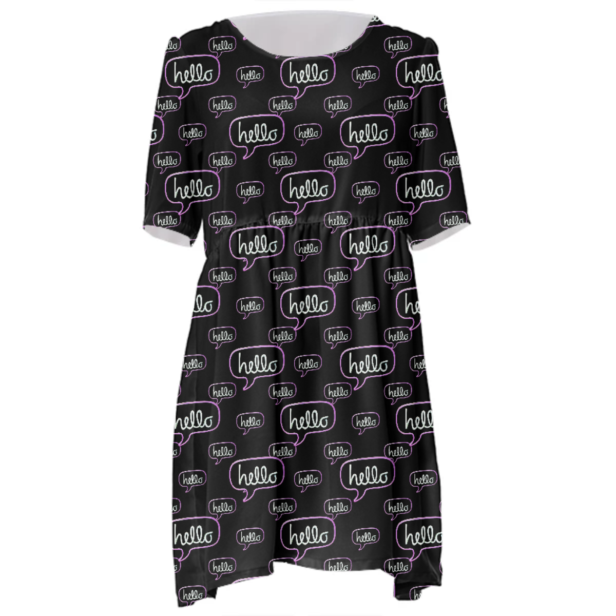 Loose swing fit babydoll dress with shirred waist short sleeves and scoop neckline. The uploaded file will be printed on the entire front and be mirrored on the back. The uploaded file will be printed on the entire front and be mirrored on the back. Because of our cut and sew process some print elements on pockets seams and sleeves might not match up. For best results please upload a PNG or JPG with RGB color profile and dimensions of at least 35 inches width by 40 inches length. DPI can be as low as 72. Since every piece is custom made, it may take 2-4 weeks for delivery. Made in our studio (Shanghai).