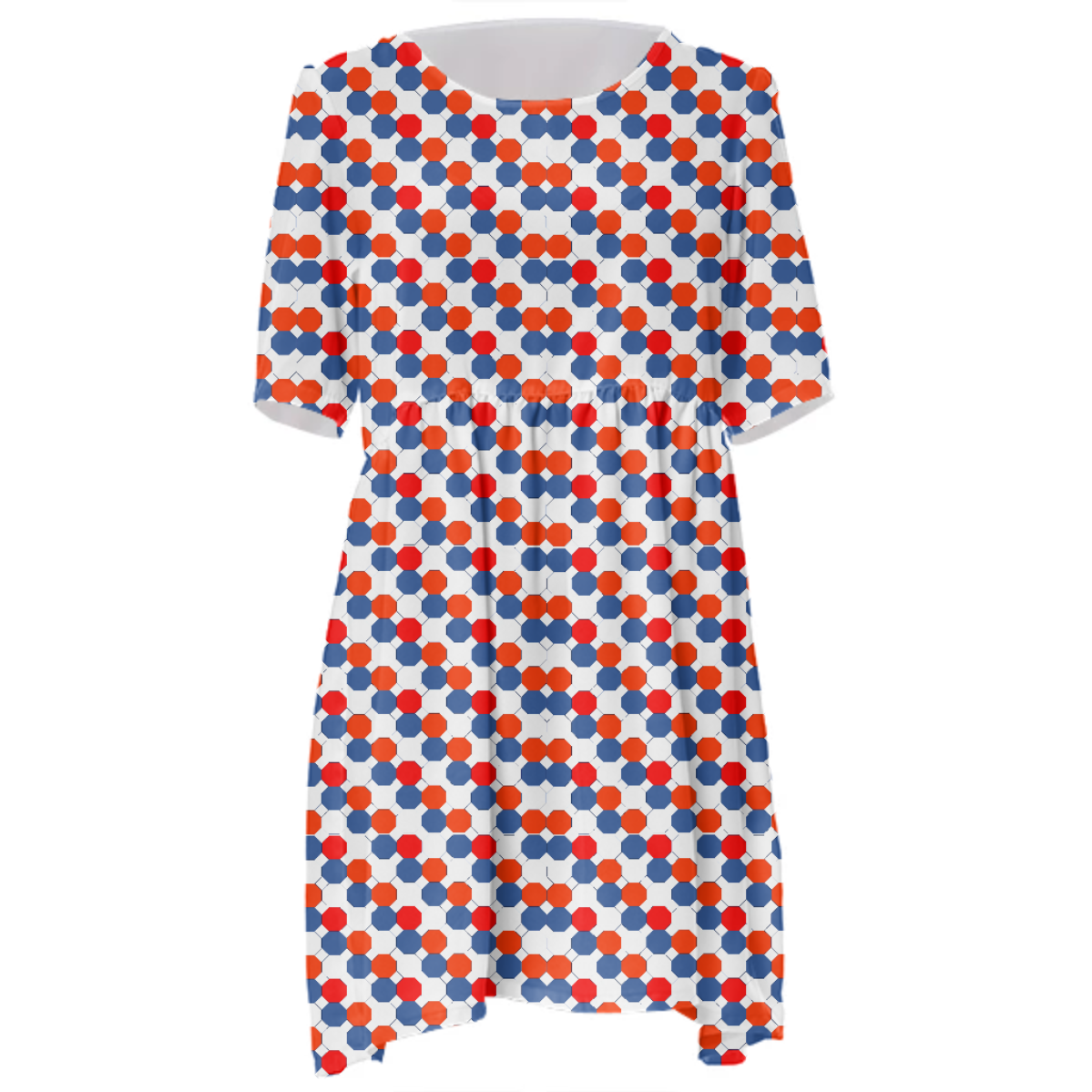 Loose swing fit babydoll dress with shirred waist short sleeves and scoop neckline. The uploaded file will be printed on the entire front and be mirrored on the back. The uploaded file will be printed on the entire front and be mirrored on the back. Because of our cut and sew process some print elements on pockets seams and sleeves might not match up. For best results please upload a PNG or JPG with RGB color profile and dimensions of at least 35 inches width by 40 inches length. DPI can be as low as 72. Since every piece is custom made, it may take 2-4 weeks for delivery. Made in our studio (Shanghai).