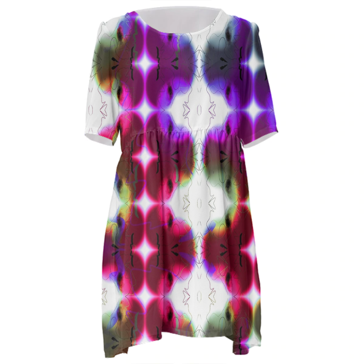 Loose swing fit babydoll dress with shirred waist short sleeves and scoop neckline. The uploaded file will be printed on the entire front and be mirrored on the back. The uploaded file will be printed on the entire front and be mirrored on the back. Because of our cut and sew process some print elements on pockets seams and sleeves might not match up. For best results please upload a PNG or JPG with RGB color profile and dimensions of at least 35 inches width by 40 inches length. DPI can be as low as 72. Since every piece is custom made, it may take 2-4 weeks for delivery. Made in our studio (Shanghai).