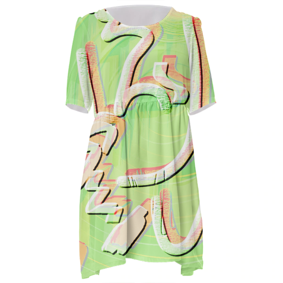 Loose swing fit babydoll dress with shirred waist short sleeves and scoop neckline. The uploaded file will be printed on the entire front and be mirrored on the back. The uploaded file will be printed on the entire front and be mirrored on the back. Because of our cut and sew process some print elements on pockets seams and sleeves might not match up. For best results please upload a PNG or JPG with RGB color profile and dimensions of at least 35 inches width by 40 inches length. DPI can be as low as 72. Since every piece is custom made, it may take 2-4 weeks for delivery. Made in our studio (Shanghai).