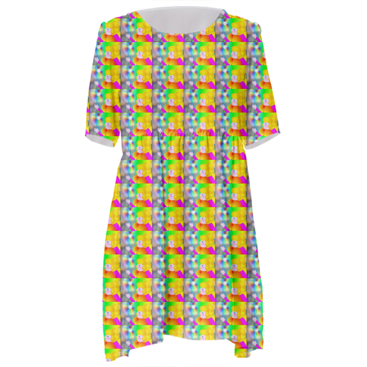 Loose swing fit babydoll dress with shirred waist short sleeves and scoop neckline. The uploaded file will be printed on the entire front and be mirrored on the back. The uploaded file will be printed on the entire front and be mirrored on the back. Because of our cut and sew process some print elements on pockets seams and sleeves might not match up. For best results please upload a PNG or JPG with RGB color profile and dimensions of at least 35 inches width by 40 inches length. DPI can be as low as 72. Since every piece is custom made, it may take 2-4 weeks for delivery. Made in our studio (Shanghai).
