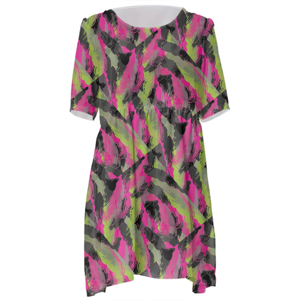 Loose swing fit babydoll dress with shirred waist short sleeves and scoop neckline. The uploaded file will be printed on the entire front and be mirrored on the back. The uploaded file will be printed on the entire front and be mirrored on the back. Because of our cut and sew process some print elements on pockets seams and sleeves might not match up. For best results please upload a PNG or JPG with RGB color profile and dimensions of at least 35 inches width by 40 inches length. DPI can be as low as 72. Since every piece is custom made, it may take 2-4 weeks for delivery. Made in our studio (Shanghai).